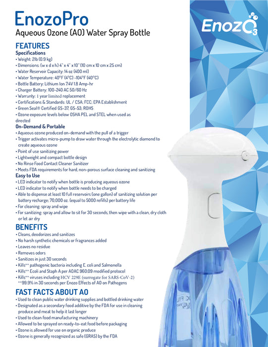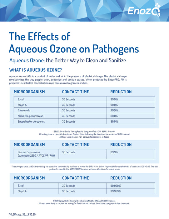 *All efficacy claims are independently tested by 3rd party laboratories. Aqueous Ozone is GRAS (Generally Regarded as Safe) by the FDA. Sanitizing Spray Bottle EPA established #089373-MA-001. The following tests were performed Using Modified AOAC 961.02 Protocol All testing done at Lapuck Laboratories in Canton, Mass., following the directions for use in the Enozo Sanitizing Spray Bottle manual. All tests were done on non-porous stainless steel surfaces.